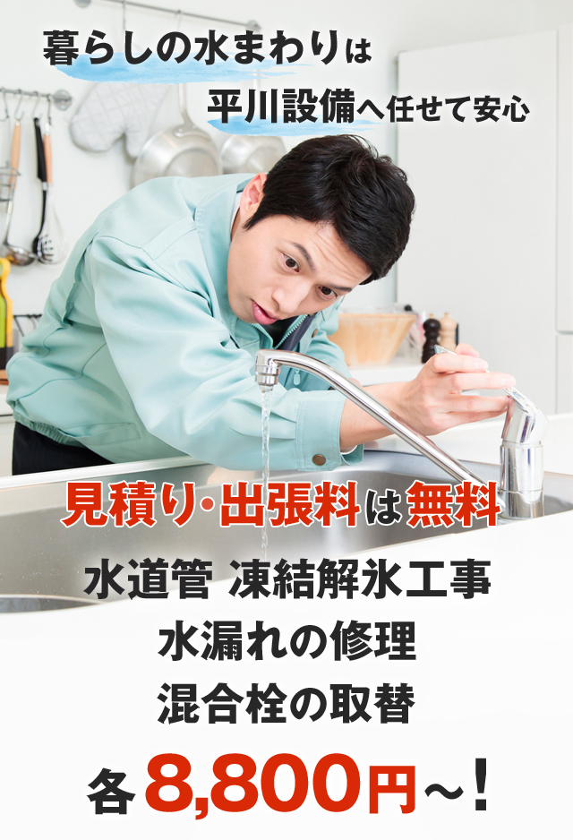 当店では、水道管の凍結解氷工事、排水詰まりの修理・清掃、水漏れ修理や蛇口・混合栓の取替、ボイラー交換まで、水まわりの幅広いサービスで、迅速かつ丁寧に対応いたします。